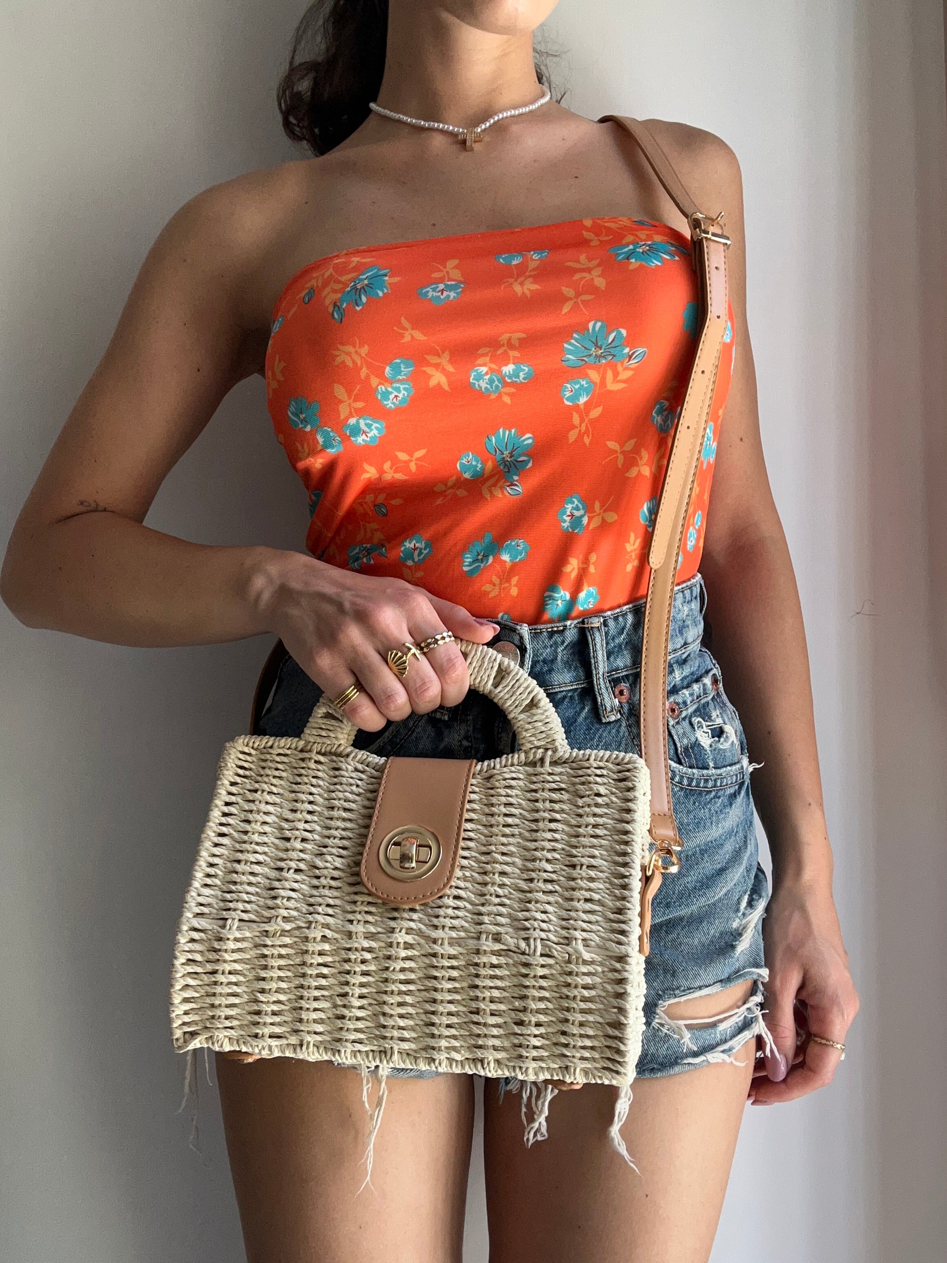 Borsa rigida in paglia con dettagli in ecopelle.