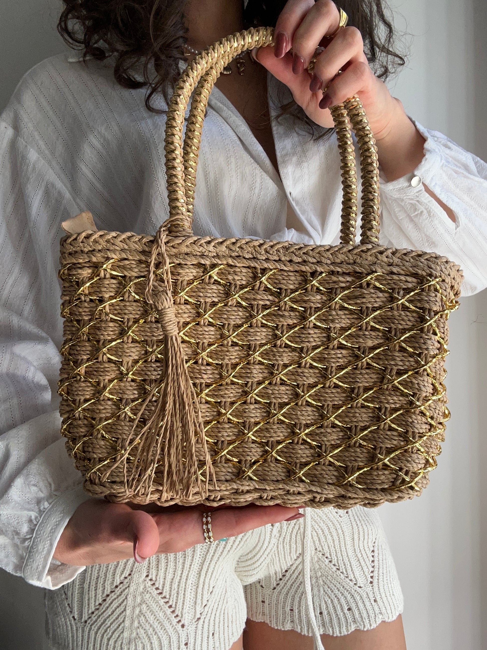 Borsa in paglia intrecciata con filo di tessuto laminato